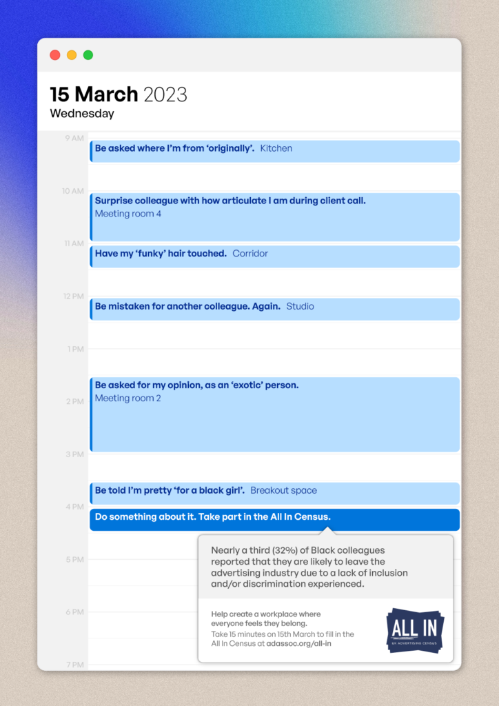 London, March 2, 2023: The advertising industry’s inclusion initiative, All In, led by the Advertising Association, the IPA and ISBA, has launched a new campaign created by 2022 UK Young Lions winners, James Danson, Art Director, Havas Lynx Group and Glenn Scholefield, Copywriter, TBWA\MCR, to promote participation in the second All In Census on March 15. The winning creative campaign depicts a hard-hitting work schedule featuring instances which highlight common discriminatory behaviour in the workplace.